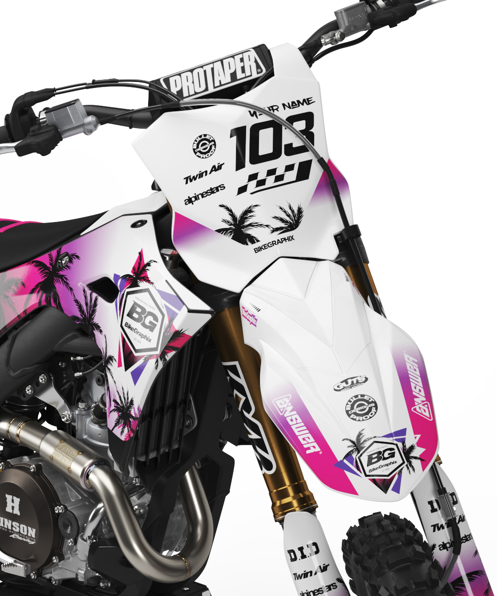 All Semi Custom Dirt Bike Graphics can be built as a full kit, shrouds only, or trim kit only.  You can also add matching number plate backgrounds and a custom seat cover.