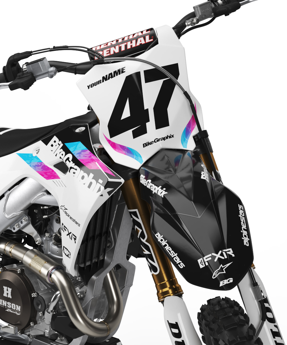 All Semi Custom Dirt Bike Graphics can be built as a full kit, shrouds only, or trim kit only.  You can also add matching number plate backgrounds and a custom seat cover.